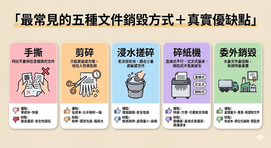 1. 手撕: 最簡單的方式,只要用手撕一撕即可。但其安全性極低,只要意圖拼湊就有機會恢復部分內容,因此僅適用於一般行政文件。