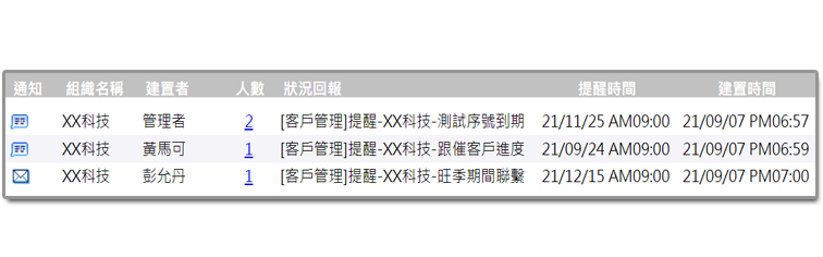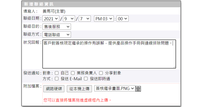 業務依據權限進行連絡紀錄回報,主管可全部檢視。另提供電子報、簡訊發送…