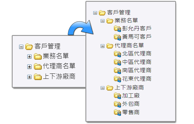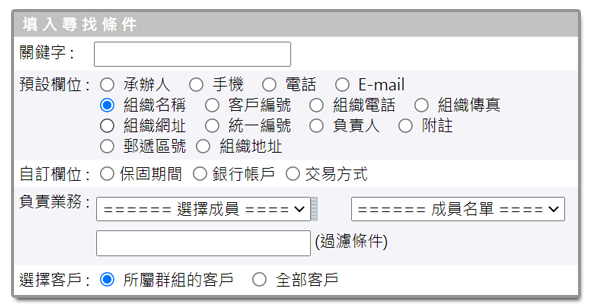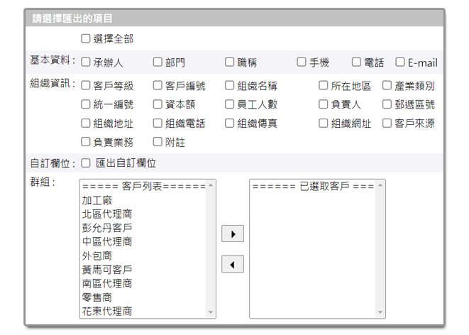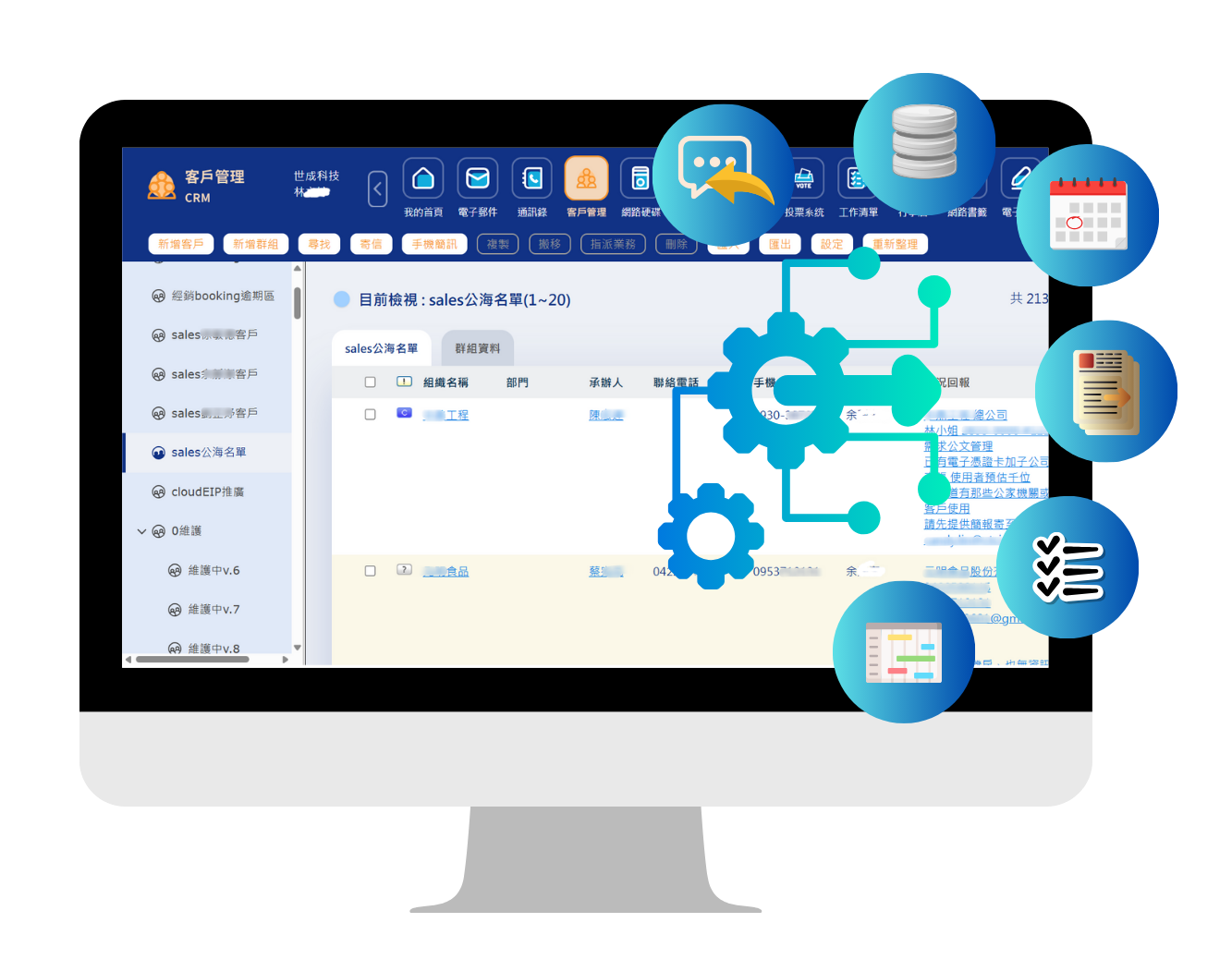 依照業務人員、地區、產業、屬性進行客戶資料分類,員工依權限檢視、編輯、匯出客戶基本資料與連絡紀錄