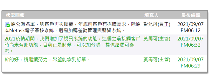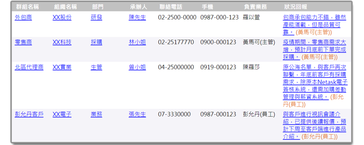 你可能會說,這些問題我們早就想到方法解決了,就是統一交給一個人去負責輸入。暫不論此方式的好壞,雖然資料統一,但進度掌握、狀況回報追蹤呢?絕大多數的公司仍仰賴業務將資料填寫在excel 再寄給主管,然而當主管收到這類信件次數多了,仍會發現資料難以追蹤。「Netask 客戶管理」能解決上述問題,人員不再受限時間、地點,透過網頁化的方式隨登即用,有效管理您的客戶群。