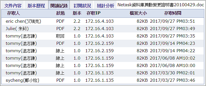 文件發佈者,隨時查閱文件的閱讀狀態、存取IP等資訊。