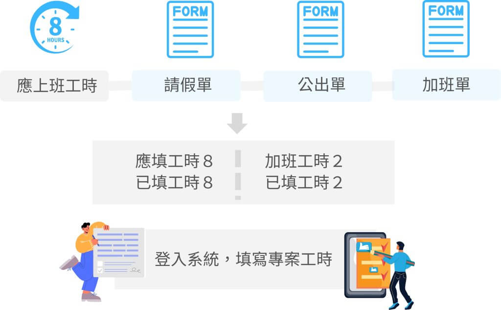 依據客戶需求,目前提供兩階段的專案工時系統。入門版提供專案工時回報,進階版本則整合差勤管理數據,功能範圍更完善。無論企業目前處於哪個階段,都能選擇適合的版本獨立使用。