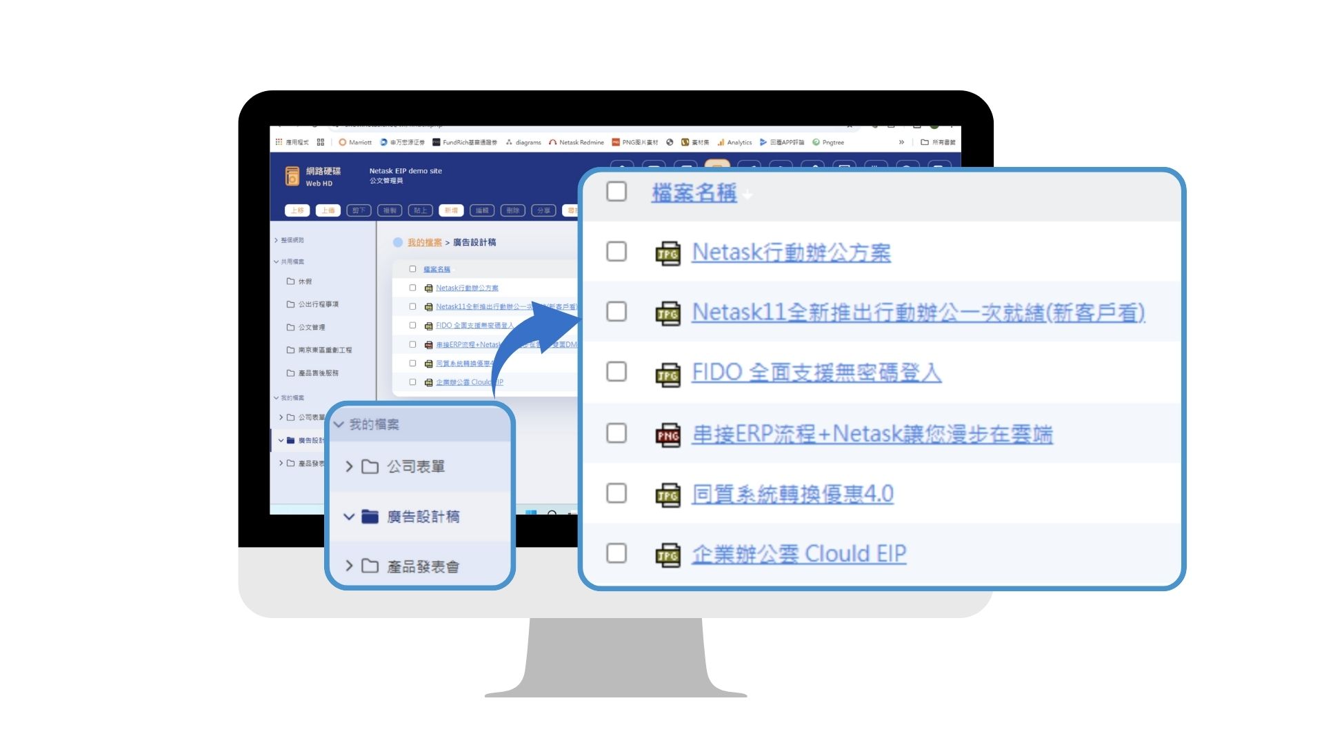 這是一套企業內部最基礎的e化管理工具,不僅提供辦公資料的儲存,透過即時通進行訊息的傳遞,降低企業內部溝通障礙,讓您輕鬆面對跨國辦公、遠距溝通管理的問題。WebStorage是模組化的架構,在您使用一段時間後,更可視需求增購簽核、差勤、專案、文管等功能,使企業e化完整的落實與應用。